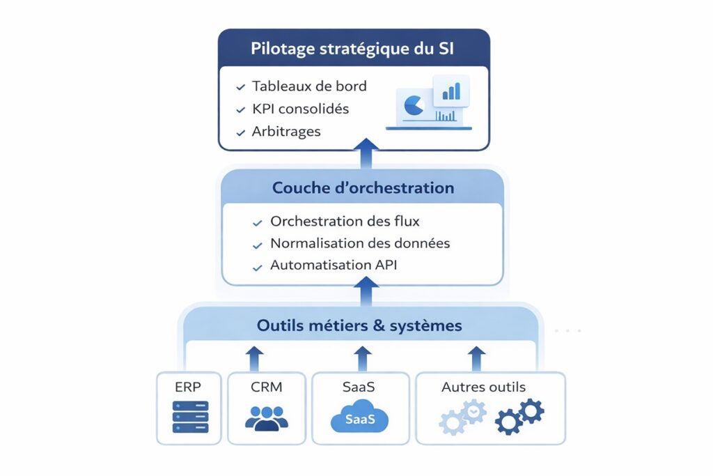 Le pilotage du SI est devenu un enjeu stratégique pour les PMI, startups en croissance et ETI multi-outils. Sans pilotage structuré, les flux se complexifient, les décisions ralentissent et la cohérence globale du système d’information se fragilise.